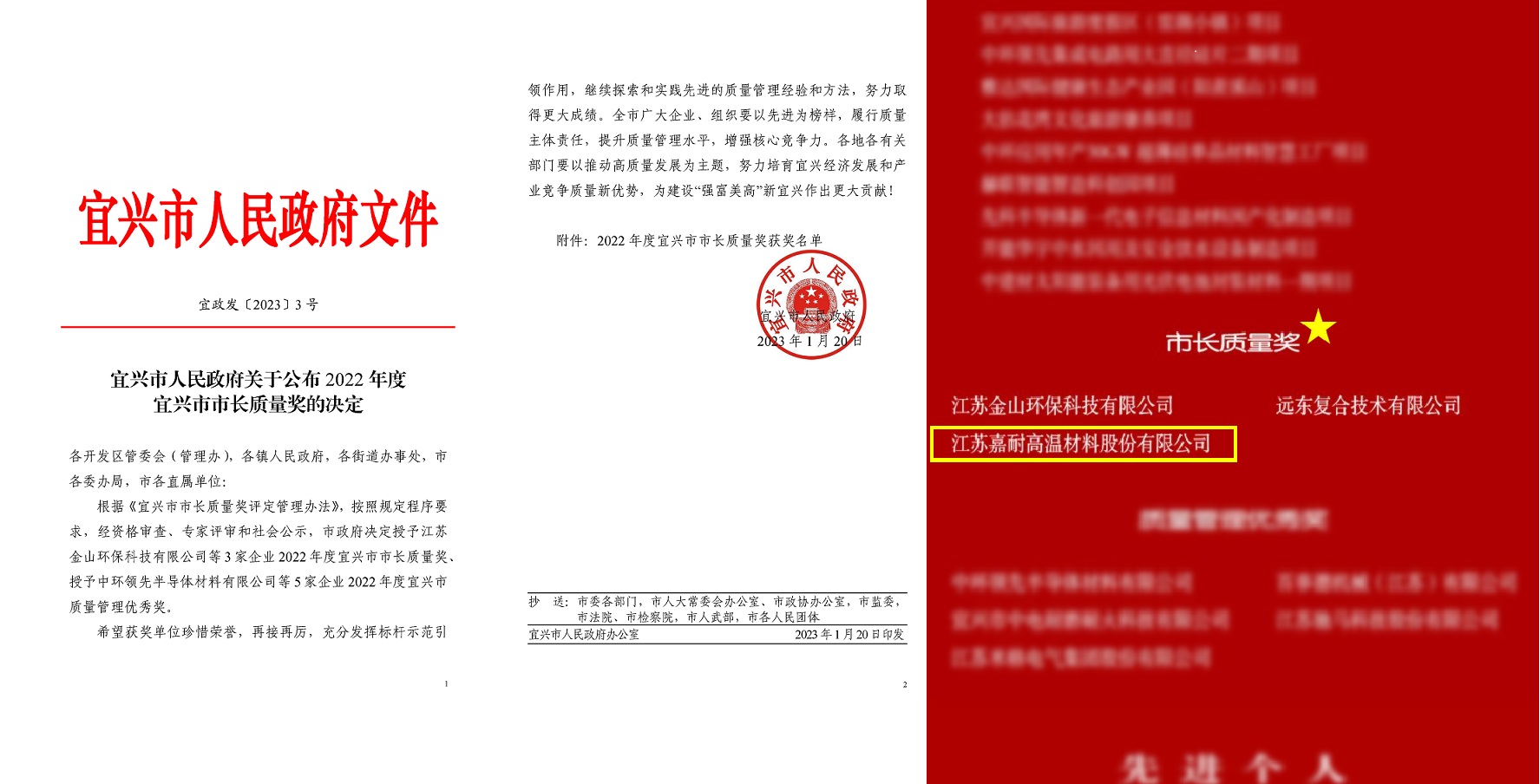 2023年1月20日,宜興市人民政府發(fā)文《宜興市人民政府關(guān)于公布 2022 年度宜興市市長(zhǎng)質(zhì)量獎(jiǎng)的決定》,根據(jù)《宜興市市長(zhǎng)質(zhì)量獎(jiǎng)評(píng)定管理辦法》,按照規(guī)定程序要求,經(jīng)資格審查、專家評(píng)審和社會(huì)公示,江蘇嘉耐高溫材料股份有限公司斬獲殊榮。